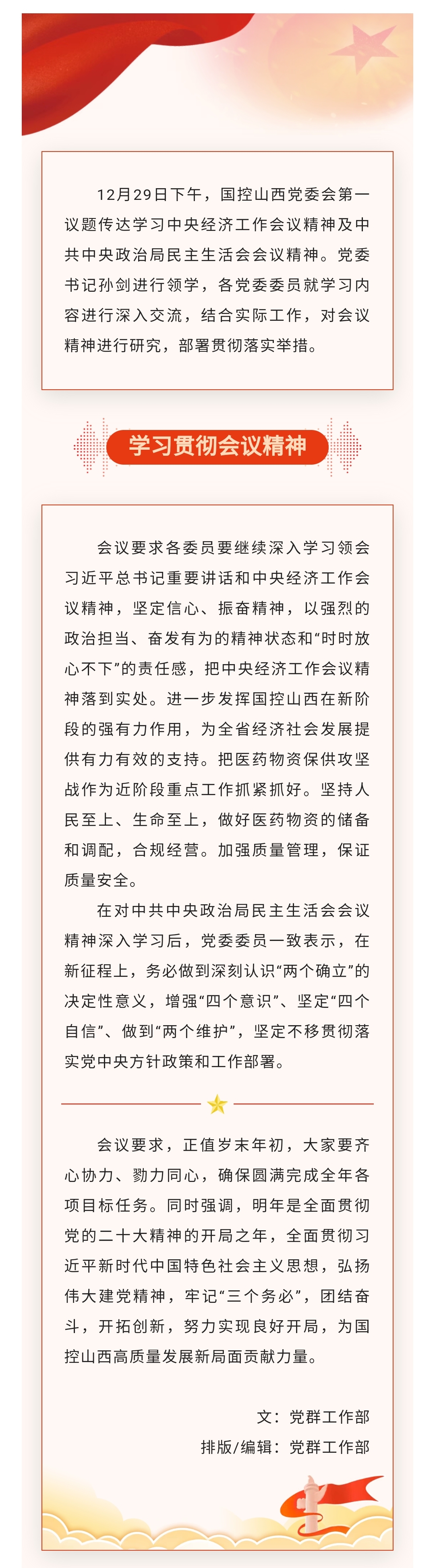 国控山西召开党委会传达学习中央经济工作会议精神及中共中央政治局民主生活会会议精神