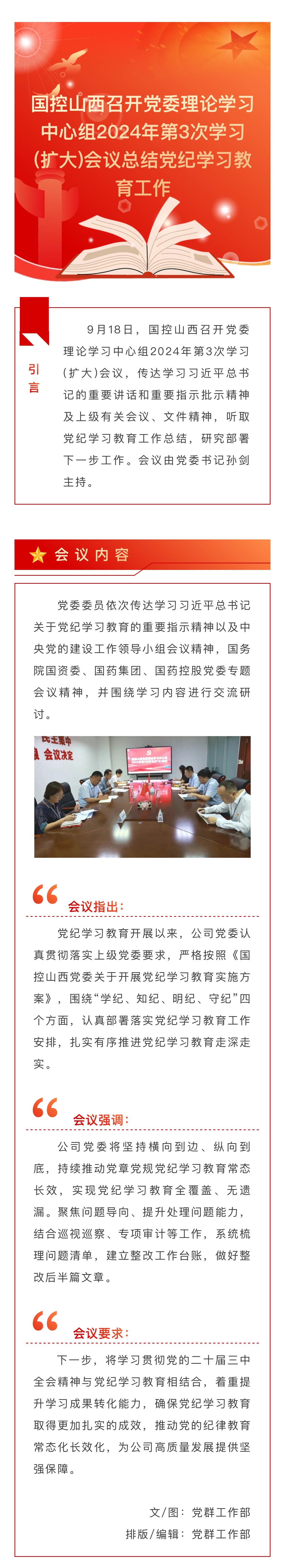 国控山西召开党委理论学习中心组2024年第3次学习(扩大)会议总结党纪学习教育工作