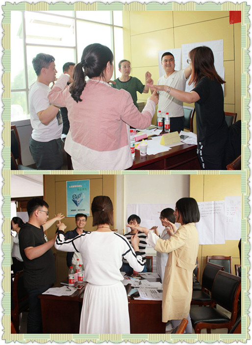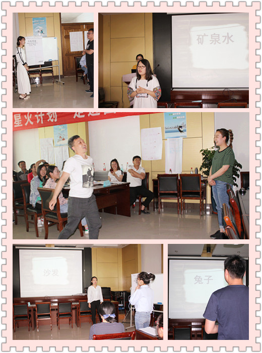 课间,老师为大家设计了“你比划我猜”和“你躲我抓”等等小游戏,大家在游戏的同时即培养了同事间的默契,又锻炼了团队凝聚力!
