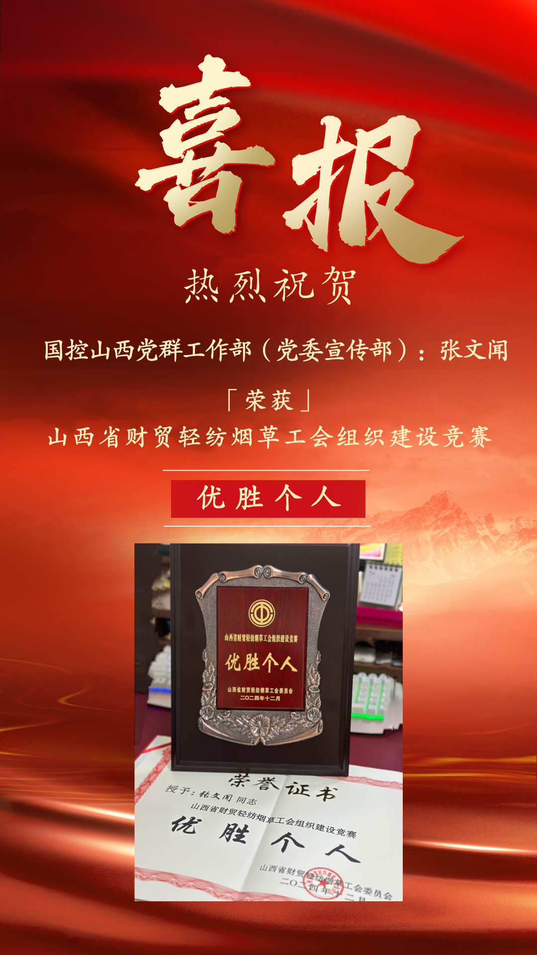 热烈祝贺国控山西张文闻「荣获」 山西省财贸轻纺烟草工会组织建设竞赛优胜个人