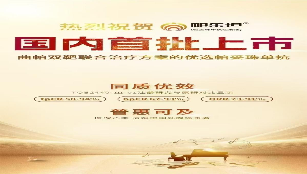 2024年12月23日,正大天晴帕妥珠单抗注射液(商品名:帕乐坦®)获得中国国家药品监督管理局颁布的药品注册批件,成为国内首批获批上市的帕妥珠单抗生物类似药,用于治疗HER2阳性早期及转移性乳腺癌。该产品在早期乳腺癌治疗中:与曲妥珠单抗和化疗联合,用于HER2阳性、局部晚期、炎性或早期乳腺癌患者(直径>2cm或淋巴结阳性)的新辅助治疗;用于具有高复发风险HER2阳性早期乳腺癌患者的辅助治疗。