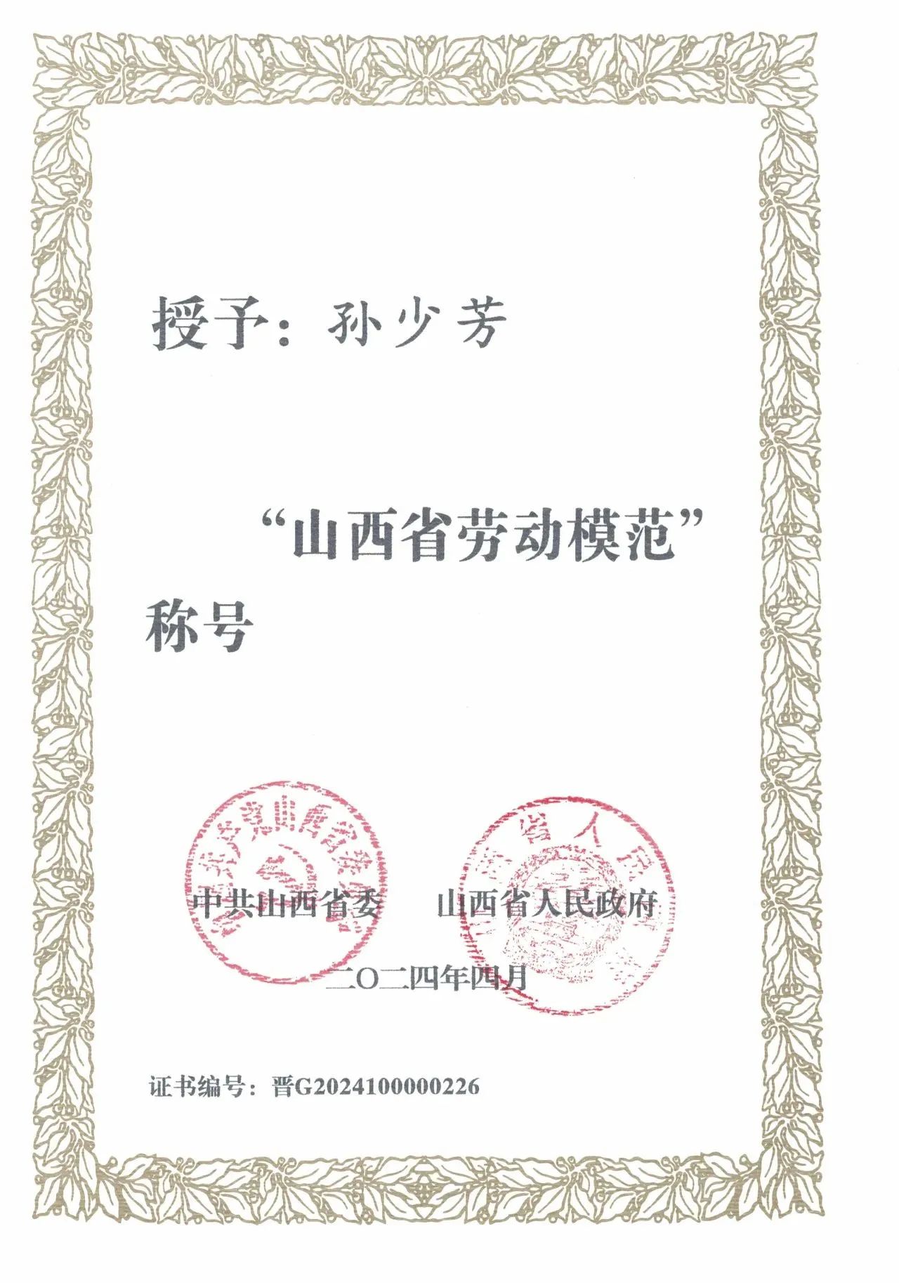 热烈祝贺国药控股山西晋中有限公司总经理孙少芳荣获“山西省劳动模范”称号。